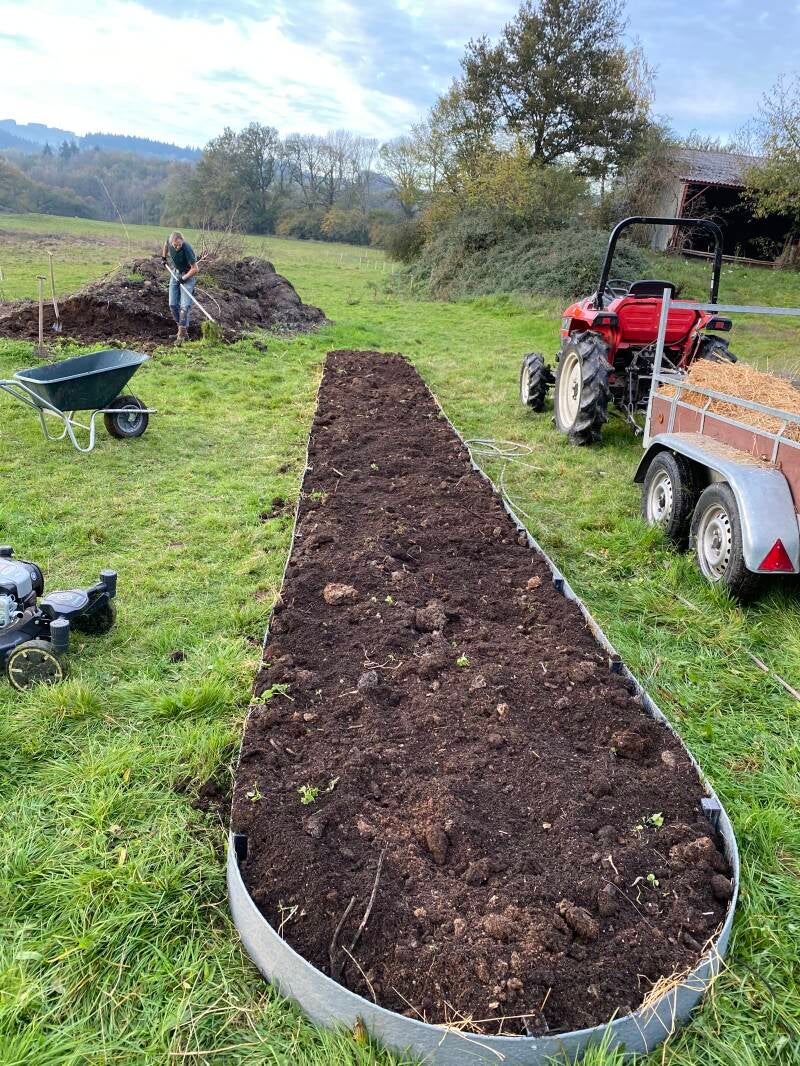 Een laag nat karton direct op de grasmat. Daarbovenop een laag stro en daarboven een laag compost (van de berg die er middenin ligt) en moestuin grond. Maximale breedte 1m20; zodat je er altijd bij kunt en er niet op hoeft te staan. Zo hou je de grond luchtig en verstoor je het bodemleven zo min mogelijk heb ik gelezen...