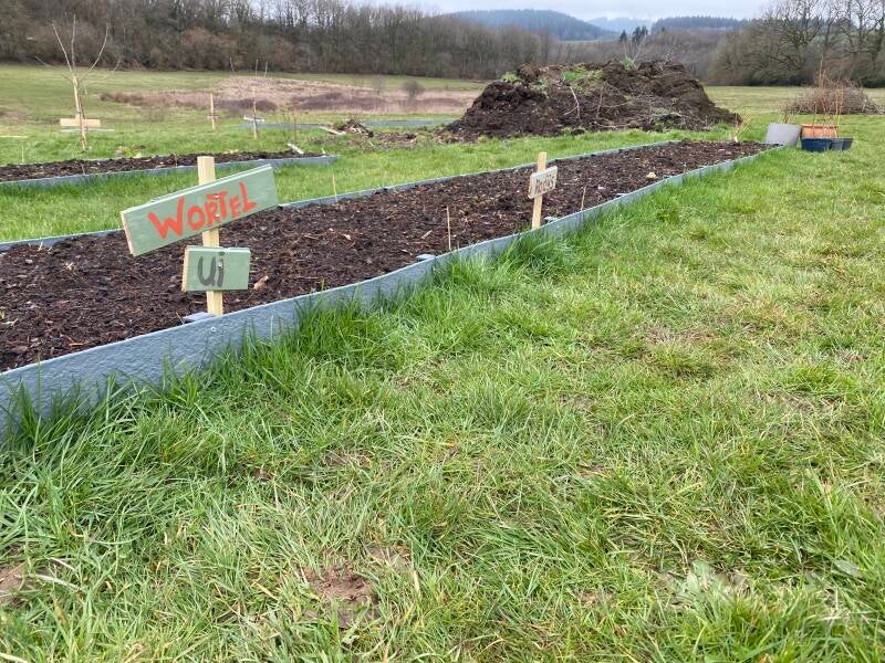 We zijn begonnen met een aantal bakken te maken in het gras. De randen hebben we gemaakt van gerecycled kunststof.