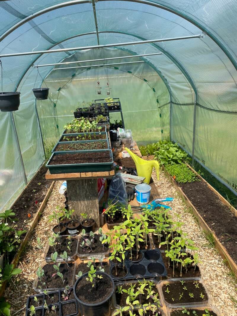 Een heel nat en vrij koud voorjaar en vroege zomer maakte het lastig te zaaien en plantjes aan te laten slaan. Inmiddels is het wel zomer geworden maar doordat de planten veel water in het voorjaar hebben gehad lijken ze minder goed tegen de droogte te kunnen en lopen de vruchten wat achter. Maar langzaam hebben we steeds meer tomaten (ook buiten de kas) en aubergines, we komen om in de courgettes, de kruiden doen het goed, we hebben een mooie aardappel- en uienoogst en er komen veel pompoenen aan! Ook dit jaar heb ik me met de bloemen niet ingehouden dus de bijen hebben ook genoeg te halen. De boerenkool, spinazie en veldsla gaan binnenkort de tuin in zodat we ook in de winter nog kunnen eten uit eigen tuin!