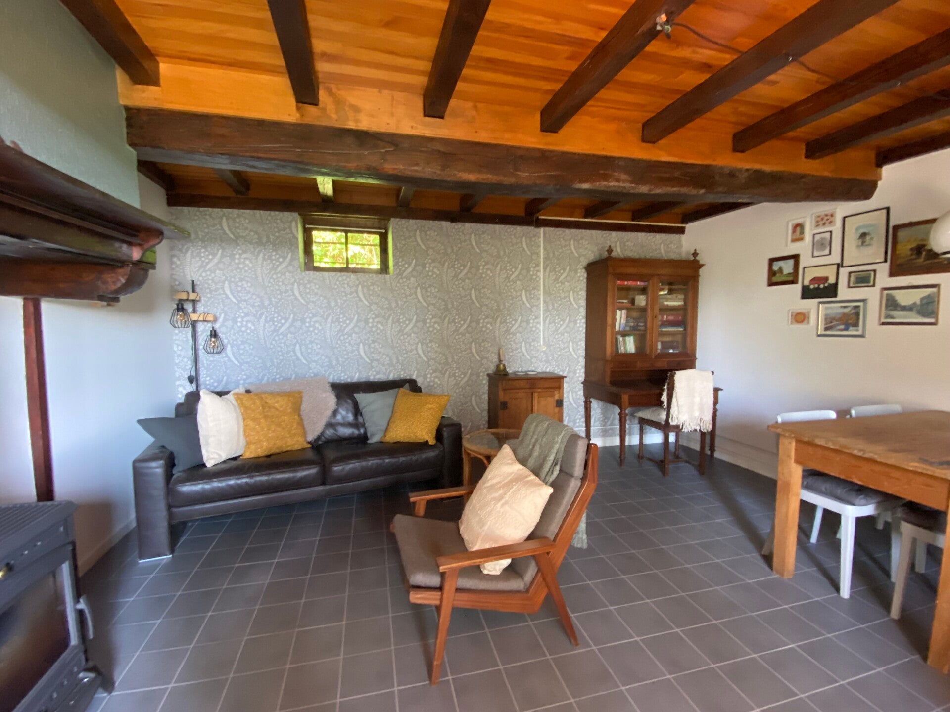 Verwarming d.m.v. houtkachel (woonkamer) en elektrische kachels (keuken en badkamer).